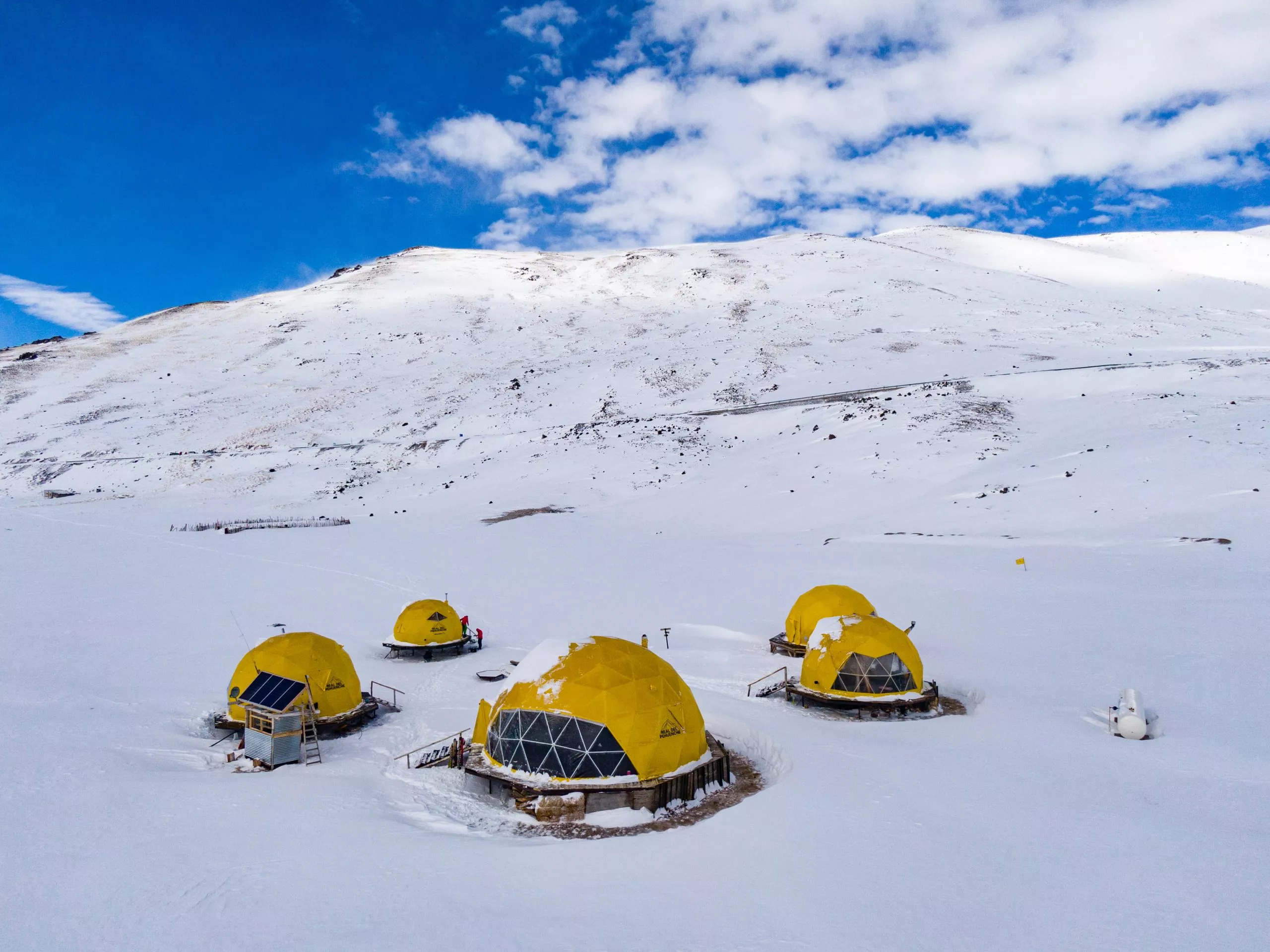 A más de 2.000 metros de altitud, en el Paso Pehuenche entre Argentina y Chile, Real del Pehuenche redefine la experiencia de glamping en plena Cordillera de los Andes. Este campamento de montaña —o “Real” en la jerga de antiguos viajeros— está formado por cinco domos geodésicos instalados sobre decks, diseñados para generar un impacto ambiental mínimo gracias a su construcción sin cemento y a energía solar. Rodeados por paisajes imponentes, ofrecen un alojamiento confortable con camas sommier, colchones de pluma, calefacción, baño privado, Wi‑Fi y estufa a leña.